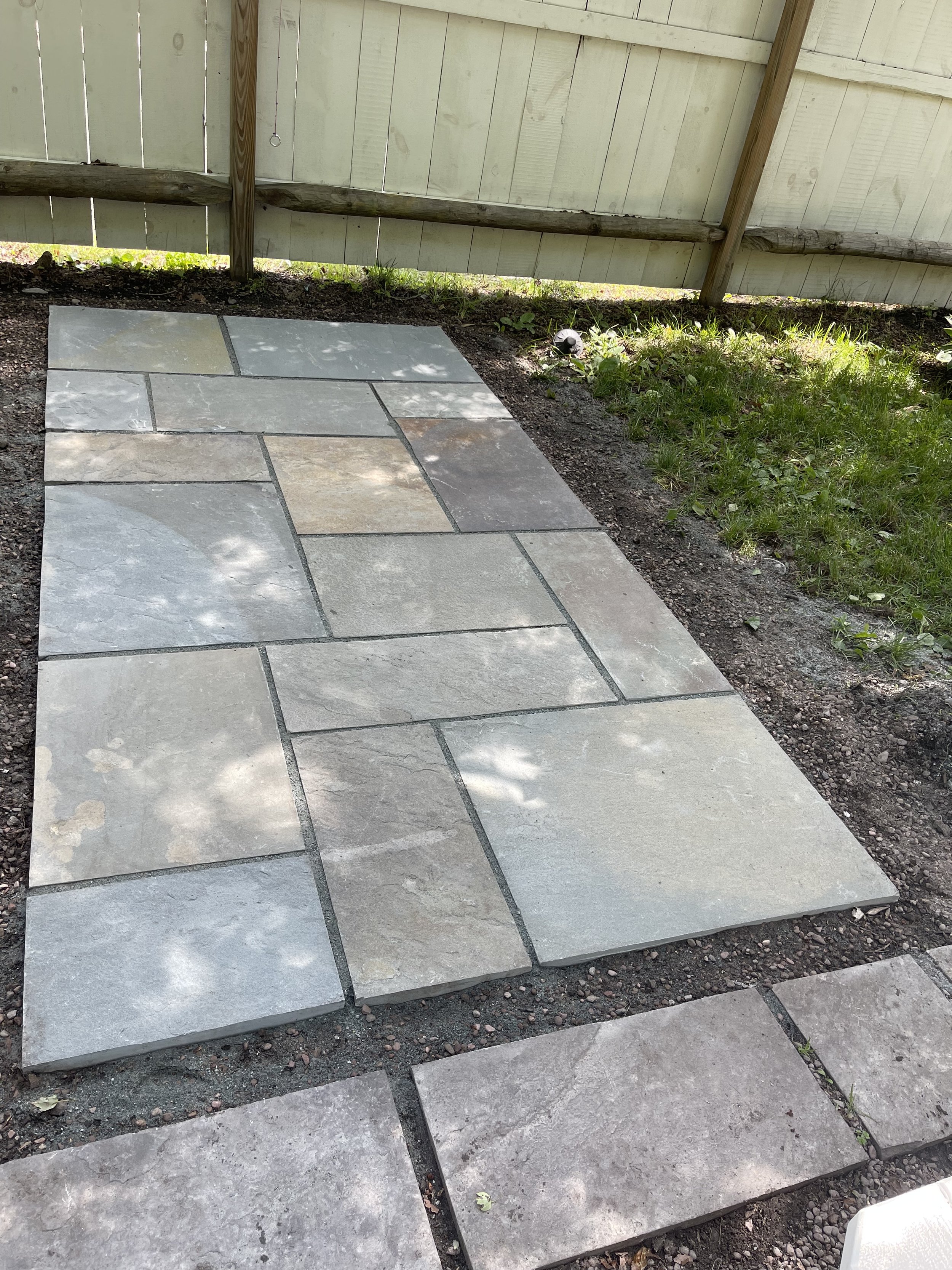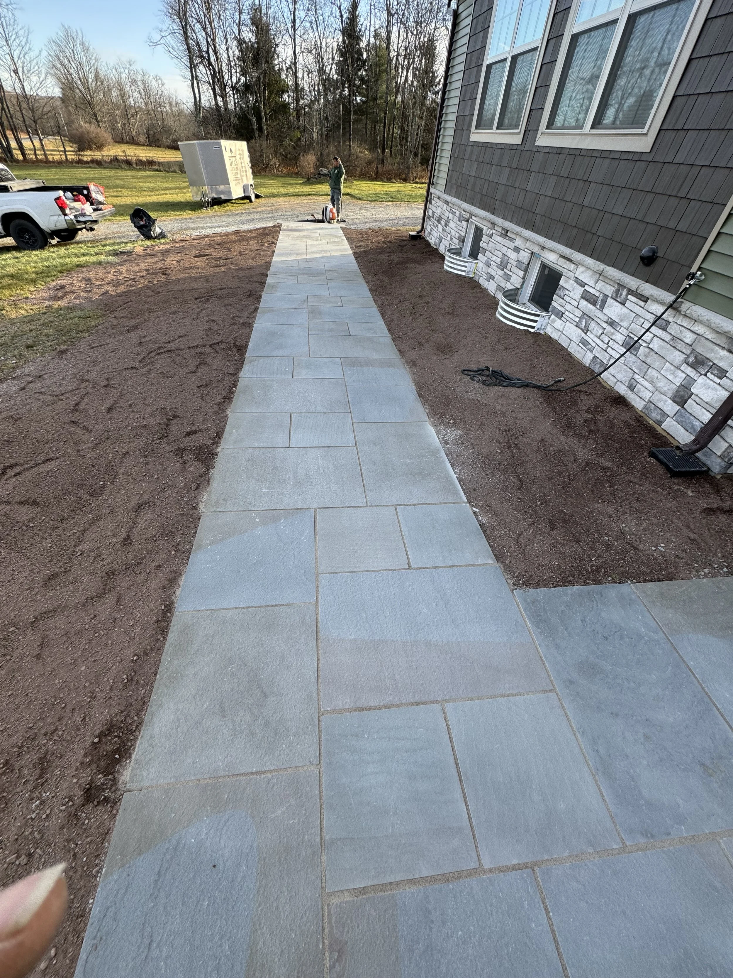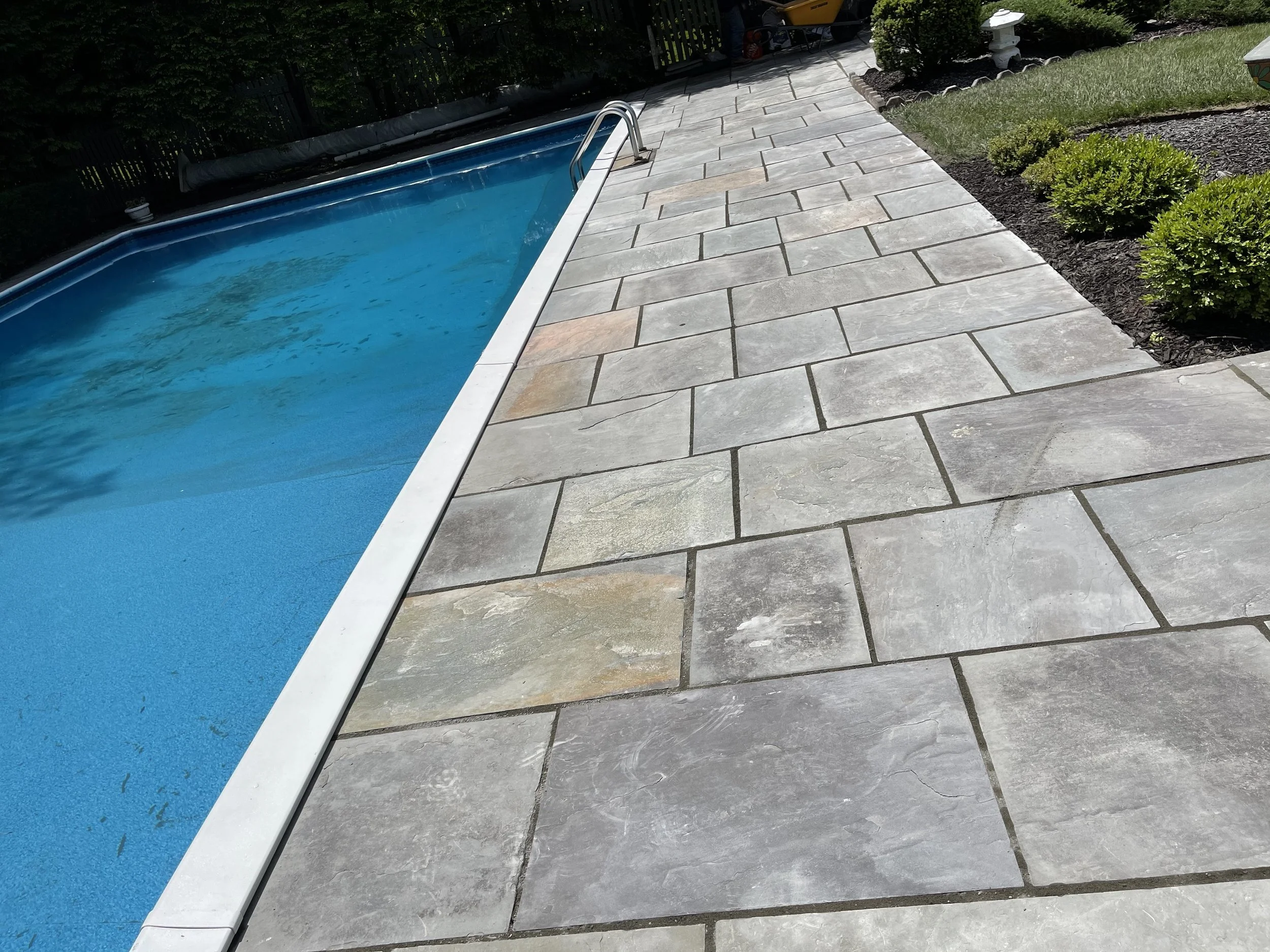 Elegant bluestone pavers being expertly installed to create a timeless, high-end outdoor space. Each stone is carefully placed on a precision-leveled base, forming a clean, durable surface perfect for patios, walkways, or pool surrounds. The rich blue-gray tones of the natural stone add sophistication and charm. In the background, skilled craftsmen restore a cracked paver—highlighting our commitment to quality and long-lasting results. Whether it’s a brand-new installation or seamless repair, this image captures the beauty and durability of professional bluestone work.