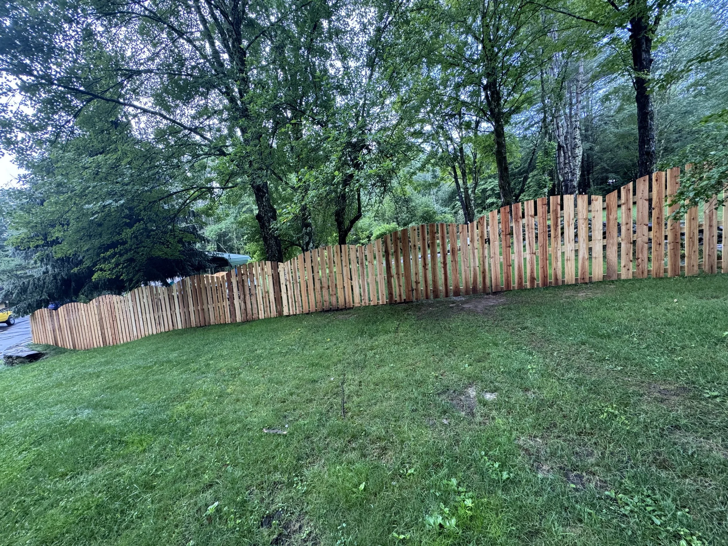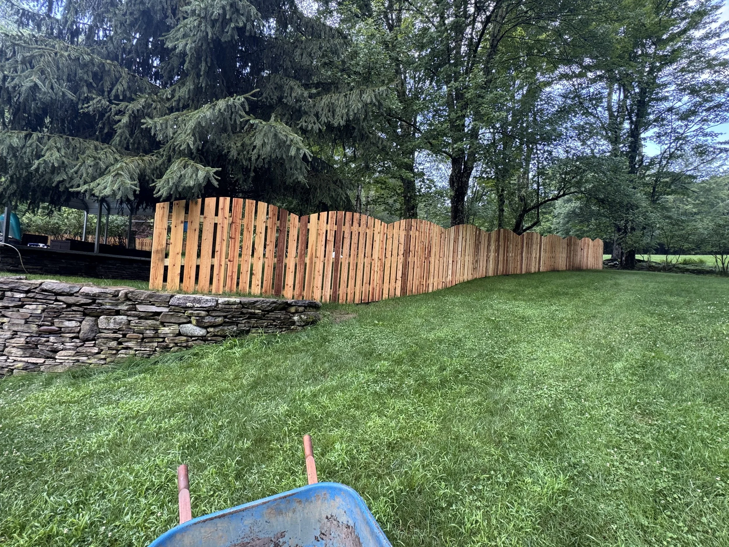 A sleek, newly installed wooden privacy fence lines a manicured yard, delivering both security and style. Professional installers set each post with precision in concrete footings, ensuring strength and longevity. Horizontal cedar boards are flawlessly aligned, offering a modern, clean look that enhances curb appeal. In the background, the team adds finishing touches, showcasing craftsmanship and attention to detail. Whether it’s wood, vinyl, aluminum, or custom fencing, this image reflects quality installation designed to elevate and protect any outdoor space.